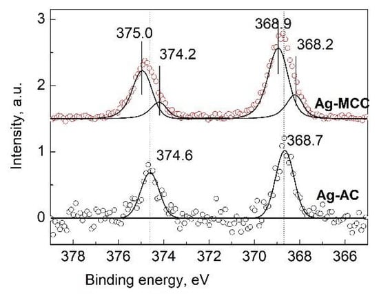 Figure 13 shows the Ag 3d photoelectron spectra of Ag-MCC and Ag-AC composites. As it can be seen, the Ag 3d spectrum of aerogel is characterized with lower signal/noise ratio compared to that of MCC, which is obviously related to the concentration of the metal in the near-surface region. A significant decrease in concentration (about 50 times) on going from MCC to gel is most likely associated with an increase in the specific surface area of the material and good dispersion of metal particles in the bulk.