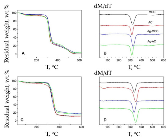 It can be seen that the temperature of the maximum decomposition rate in argon for AC (349 °C) is noticeably higher than for MCC (336 °C). It was previously shown that cellulose aerogels have a mesoporous morphology. Thermal conductivity of the material depends on the pore size. With the appearance of pores with diameter less than the average free path of gas molecules (67 nm-air and 64 nm-argon at a pressure of 1 atm), the thermal conductivity is reduced, which affects the higher thermal stability of aerogel in comparison with microcrystalline cellulose. In the air atmosphere, there is an inverse relationship, the cause of which may be explained by the presence in the AC of a developed system of pores and the greater availability of polymer chains to oxidation by air oxygen at elevated temperatures. This opposite behavior of cellulose-based materials upon heating can be explained by a different mechanism of destruction. The effect of silver on the thermal stability of cellulose-based composites was not detected, like what was found in [64,65]. The amount of solid residue in the air of all samples containing metallic silver is the same and amounts to no more than 2%.