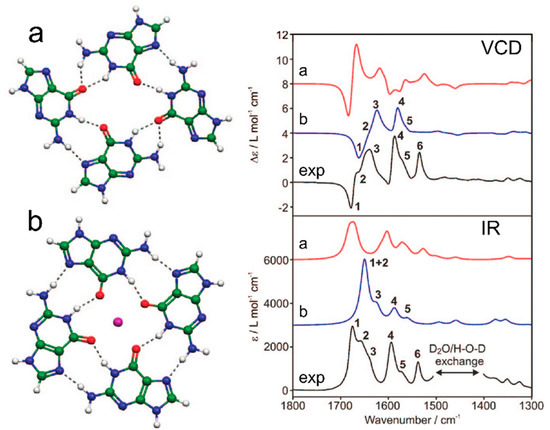 - Setnička, V.; Nový, J.; Böhm, S.; Sreenivasachary, N.; Urbanová, M.; Volka, K. Molecular Structure of Guanine-Quartet Supramolecular Assemblies in a Gel-State Based on a DFT Calculation of Infrared and Vibrational Circular Dichroism Spectra. Langmuir 2008, 24, 7520–7527. [Google Scholar] [CrossRef]