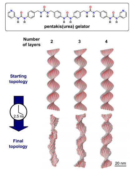 - Van Lommel, R.; Rutgeerts, L.A.J.; De Borggraeve, W.M.; De Proft, F.; Alonso, M. Rationalising Supramolecular Hydrogelation of Bis-Urea-Based Gelators through a Multiscale Approach. ChemPlusChem 2020, 85, 267–276. [Google Scholar] [CrossRef] [PubMed]