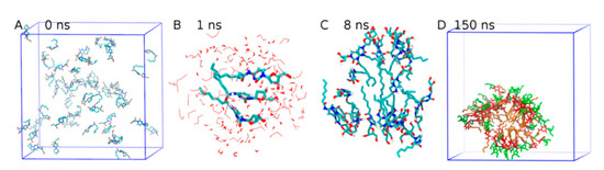 - Nguyen, H.D.; Hall, C.K. Molecular dynamics simulations of spontaneous fibril formation by random-coil peptides. Proc. Natl. Acad. Sci. USA 2004, 101, 16180–16185. [Google Scholar] [CrossRef] [PubMed] [Green Version]