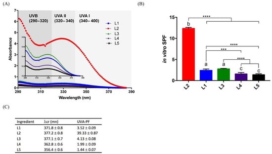 Ultraviolet photoprotective performance of lipsticks. UV absorbance spectra profile (A), in vitro SPF (B) and UVA protection factor (UVA–PF), critical wavelength (λcr) (C) SPF, λcr and UVA–PF values are expressed as mean ± SD of six experimental measurements per lipsticks. An asterisk indicates a statistical difference between formulations, ***: p < 0.001, ****: p < 0.0001, one-way ANOVA followed by Tukey’s multiple comparisons post hoc test for (B). Bars that do not share similar letters denote statistical significance, p < 0.05.
