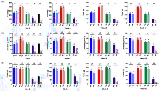 Lipstick instrumental attributes (hardness, stiffness and firmness) obtained by texture profile analysis (TPA) were reported based on the measurement of the maximum force to compress the lipstick. The effect of lipstick ingredients, storage temperature and storage time during TPA were evaluated (Figure 2). Hardness depends generally on the type and amount of waxes in the formulation [21], the oil polarity [28] and the oil:wax ratio [29]. In all lipstick formulations, the oil:wax ratio was constant for L1 and L4 formulations but lower than L2 < L3 due to the addition of white petrolatum. Generally, hardness of L2 at 25 °C and L3 at 25/45 °C did not change significantly over 12 weeks. However, L2 at 45 °C, and L1 and L4 formulations at 25/45 °C became softer after 12 weeks (p < 0.05) (Figure 2A). Furthermore, the difference in hardness between L1 at 25 °C and 45 °C at weeks 4 and 8, L3 at 25 °C and 45 °C at weeks 4 and 12, as well as for L4 at 25 °C and 45 °C during the whole study was statistically significant and attributable to softer lipsticks at 45 °C (p < 0.05). L4 was statistically significantly weakened and easier to bend than the other formulations. A commercial formulation (L5) was also tested in a single time point on day 1 and at both temperatures, as a reference formulation. Hardness of L5 was similar to L3 at 25 °C (p > 0.05) and closest to L4 at 45 °C. Acceptable solid lipsticks for the consumers should achieve at least 30 g-force (gf) at 20 °C for 8.1 and 12.7 mm diameter stick, as reported for current patented lipsticks [30,31,32]. Consequently, hardness values of all lipsticks were considered acceptable since values were above those of the commercial formulation or above 30 gf at 25 °C. The material properties of DBS organogels (L1 and L3) and especially the formulation without organogelator (L4) were also affected by higher temperatures. Indeed, at higher temperatures waxes become softer and are responsible for weak network strength [33]. Interestingly, the presence of LMOG as well as higher organogelator concentration increased thermal stability of the global network. These results were previously confirmed in different studies reported by Esposito et al., wherein 12-HSA-based organogels heated up above Tgel temperature undergo a molecular reorganization due to disruption of physical interactions between organogelator molecules [16].