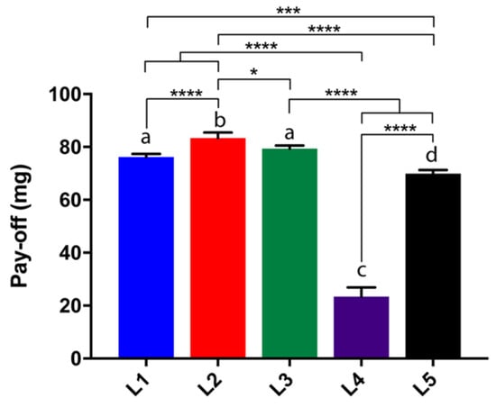 Pay-off to fabric of lipsticks (expressed in mg, mean ± SD, n = 6). An asterisk indicates a statistical difference between formulations. * p < 0.05, *** < 0.001, **** p < 0.0001, One-way ANOVA followed by Tukey’s multiple comparison test. Bars that do not share similar letters denote statistical significance, p < 0.05.