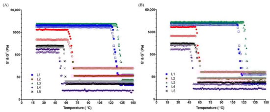 The temperature sweeps are displayed in Figure 4 and were performed in LVR regime to assess the effect of organogel-based lipsticks between 15 °C and 150 °C on the dynamic elastic behaviour (G′) and the dynamic viscous behaviour (G″). The organogel-based lipsticks exhibited thermoreversibility and viscoelastic properties. According to the classical viscoelasticity theory, the initial rise in G′ is due to 3D network formation, while onset sol-gel phase transition (Tgel) of each lipstick can be estimated from the abrupt increase in G′. Indeed, Tgel is determined by the G′/G″ crossover point from G′ < G″ to G′ > G″ of each cooling curve. A crossover point of G′ and G″ is identified as the gel melting point (Tm). Upon cooling, the resulting disordered fluid-like state of the gel undergoes a sol-gel transition generating a viscoelastic solid-like structure of crystalline organogelator molecules [12]. L1 and L3 showed a crossover point at high temperatures underlying a more stable network with highest melting stability [7,40], while L2 and especially L4 and L5 were more heat amenable and prone to soften at low temperature.