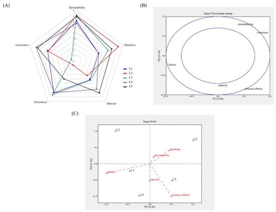 Sensory evaluation results of the produced and commercial lipsticks after application. Spider-plot (A), correlation loadings of the principal component analysis (PCA) for all the sensory attributes (B), and biplot representation of PCA illustrating relationship between attributes and formulations (C).