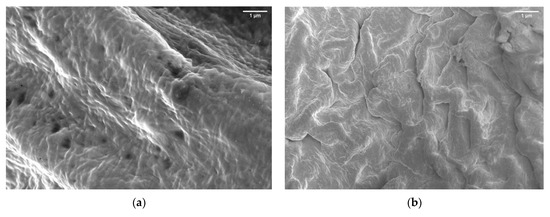 In Figure 1a, the diameter of LCNF fiber is about 10 nm and the length is over 100 nm. Based on this result, LCNF was still found as a bundle of fibers. The aggregation of fiber to form a bundle of fibers occurred because of the presence of hemicellulose; this phenomenon has been mentioned in several studies [16,20]. Further mechanical treatments are needed to enhance the individualization of LCNF fiber, as shown in Figure 1b. After the LCNF was treated using high-pressure homogenizer, the obtained result showed a better individualized fiber. The use of high-pressure homogenizer promotes the diameter of fiber into less than 5 nm. We can assume that high-pressure homogenizer maximizes the role of the carboxylic group, which is present on the LCNF surface, especially the electrostatic repulsive force between the LCNF fibers [21,22,23,24]. As a result, at the end of this process, a transparent gel-like form was obtained. This was the result of the applied pressure during high-pressure homogenizer, in which water was forced to be adsorbed by the individualized fiber. The surface characteristics of PEGDA/LCNF and PEGDA itself are shown in Figure 2a,b.