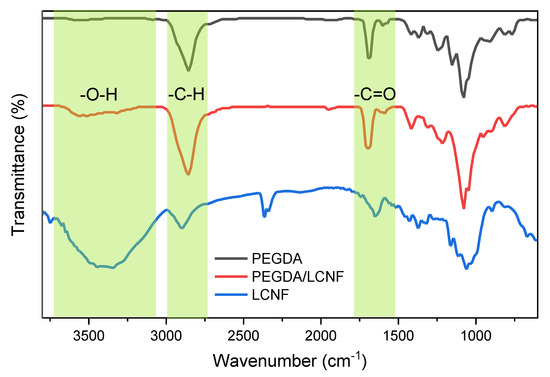 The Fourier Transform Infrared (FT-IR) spectra of PEGDA, LCNF, and PEGDA/LCNF are shown in Figure 3.