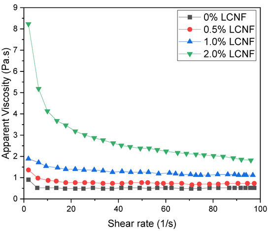 As mentioned in the previous study, nanocellulose can enhance the apparent viscosity and help PEGDA to support the gel structure. For the first two mixtures, there was no significant change in the apparent viscosity as the shear rate increased; however, a shear thinning property can be observed in the third mixture, which consisted of 2.0 w/v.% of LCNF.