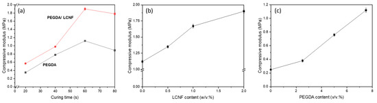 Compression modulus of PEGDA LCNF: (a) effect of curing time, (b) effect of LCNF content, and (c) effect of PEGDA content.