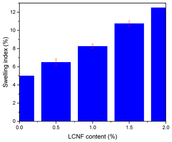 The ability of PEGDA/LCNF to absorb water was determined through a swelling test by calculating the swelling ratio of each hydrogel. The hydrogel was treated by soaking it in distilled water for 24 h. This treatment was performed to obtain the swelling ratio of each hydrogel at the equilibrium condition. The hydrogel used for this characterization was the one with a composition of PEGDA 7.5 v/v.% and LCNF 0.5–2.0 w/v% and a curing time of 40 s. The swelling ratio of each hydrogel is shown in Figure 6, which increased as the amount of LCNF increased. In addition, the highest swelling ratio among these prepared hydrogels was at 12.5%. The PEGDA hydrogel only has a 5% swelling ratio. These data can be explained based on the LCNF structure, which is rich in the hydroxyl group on its surface. As common knowledge, the hydroxyl could interact with water through hydrogen bonding. With this swelling ratio value, PEGDA/LCNF could have a good ability as the matrix to entrap the anthocyanin extract, and the sensitivity of the anthocyanin extract in this matrix could be enhanced, as mentioned in a previous study [34].