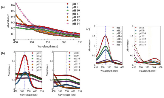 The statistical analysis was performed to determine the significant differences of L*, a*, and b* values in the range of pH 7.0–14.0. The results were reported in the format of the mean ± standard deviation (SD). One-way ANOVA with Tukey test was used for multiple comparison between data. The level of confidence was that of p ≤ 0.05.