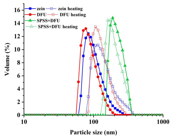 The particle size of colloidal particles: zein: the colloidal particles prepared with native zein; zein + DFU: the colloidal particles prepared with zein treated with DFU; zein + DFU + SSPS: the colloidal particles prepared with DFU combined with SSPS. (The solid curves represent the particle size of colloid particles without heating treatment; the modest curves represented the particle size of the colloid particles heated for 60 min).