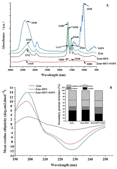 FTIR is a common way to analyze the secondary structure of organic matter. As shown in Figure 5A, native zein showed a prominent absorption peak at 3310 cm−1, caused by the stretching vibration of N–H [40]. Compared to native zein, zein treated with DFU shift little at the hydrogen bond (3200–3400 cm−1, N–H stretching) position, revealing that DFU could not destroy hydrogen bond of zein. For the samples of zein coated with SSPS under ultrasonication, the hydrogen bond positions shifted from 3310 cm−1 to 3410 cm−1, indicating that zein and SSPS interacted with each other by hydrogen bonds, facilitating the formation of new complex. In addition, amide II band (1530–1550 cm−1, N–H deformation, and C–N stretching) positions shifted from 1540 cm−1 to 1526 cm−1 and 1530 cm−1, respectively. These results indicated that the electrostatic interactions between zein and SSPS treated with DFU. Furthermore, 1700–1600 cm−1 is the peak position of the amide I band and the peak position of the α-helix is 1650–1660 cm−1. After zein was coated with SSPS under ultrasonication, the peak position shifted from 1658 cm−1 to 1680 cm−1, indicating that the addition of SSPS changed the secondary structure of zein. Moreover, after adding SSPS to the zein suspension, a new peak appeared at 1080 cm−1, which might be attributed to the combination of zein and SSPS leading to the formation of a stable complex.
