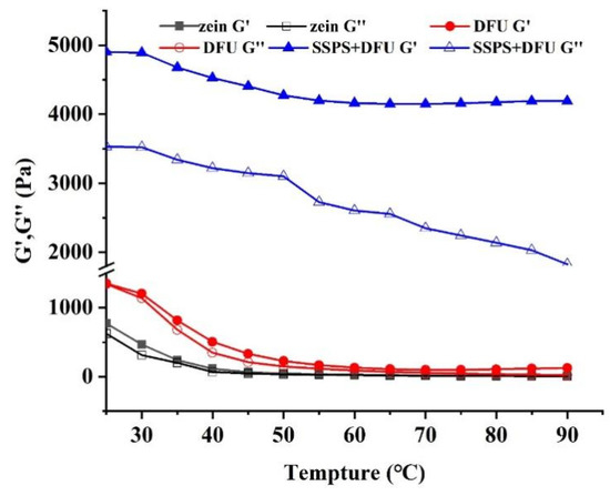 The changes of G′ (filled symbols) and G″ (open symbols) of HIPEs during temperature scanning. zein: the colloidal particles prepared with native zein; zein + DFU: the colloidal particles prepared with zein treated with DFU; zein + DFU + SSPS: the colloidal particles prepared with DFU combined with SSPS.