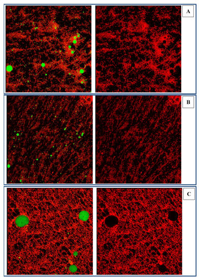 Confocal Laser Scanning Microscopy (CLSM) is usually used to observe the distribution of oil droplets and proteins in the emulsion. Figure 7 is a CLSM diagram, in which the red part was stained with Fast Green, representing the distribution of the proteins. Meanwhile, the green part was stained with Nile red, representing the distribution of the oil droplets. As shown in Figure 7A, the oil droplets stabilized by native zein colloidal particles were small, and the protein distribution was uniform. Upon further observation, there was almost no protein aggregation on the surface of the oil droplets. When treated with DFU (Figure 7B), the oil droplets were smaller than those stabilized by native zein, contributing to the enhancement of stability. As shown in Figure 7C, a three-dimensional (3D) network structure was formed once zein was combined with SSPS, which fixed the oil droplets to prevent them from aggregating. It follows from the above that appropriate use of SSPS could improve the stability of the emulsion. For Figure 7C, lots of network structures were available without oil droplets illustrated that the visible network structure and the oil drops may not on the same plane. It is speculated that DFU treatment causes zein to expose more hydrophobic groups [48], which allows zein to provide more binding sites and bind more SSPS. Moreover, SSPS molecules also bind to each other through non-covalent bonds. On this basis, a three-dimensional spatial structure is formed due to molecular cross-linking [49]. Owing to the formation of the three-dimensional network structure, the oil droplets were firmly anchored in a three-dimensional network, less likely to collide with each other, so that the emulsion remained stable even though the oil drops were larger.