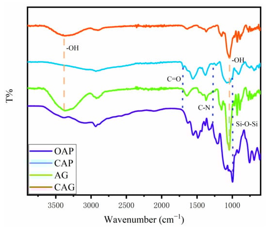 In the infrared spectrum (Figure 1), the Si-O-Si band at 1000 cm−1 can confirm the core structure of OAP, so it can prove the successful synthesis of POSS [38,39]. In addition, the infrared peak at 1208 cm−1 belongs to the C-N stretching vibration on the eight aminopropyl groups of POSS, the bands at 3385 cm−1 and 3095 cm−1 belong to the N-H stretching vibration, and the infrared peak at 1628 cm−1 belongs to the N-H bending vibration. After reacting with citric acid, the Si-O-Si band at 1000 cm−1 showed no significant changes, which means that the cage core structure remained intact. In addition, the peak at 1702 cm−1 belongs to the C=O stretching vibration, which also proves that the amino group in POSS reacted with the citric acid. Moreover, the shift of the C-N stretching vibration peak at 1394 cm−1 proved the formation of tertiary amines, which proved the formation of CAP. Figure S1 and Table S1 are the MS information of OAP and CAP, respectively, which confirmed that the OAP and CAP were synthesized successfully without impurities.