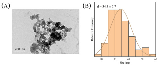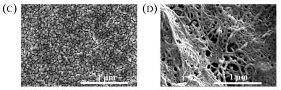 The morphology and structure of CAP was characterized by transmission electron microscopy (TEM). As shown in Figure 2A, the CAP imaging results show that CAP is easy to agglomerate into irregular spherical particles with an average diameter of 34.3 ± 7.7 nm and show the formation of agglomerates (Figure 2B). The change proves that CAP is easy to aggregate. As shown in Figure 2C,D, we used a scanning electron microscope (SEM) to observe the morphology of AG and CAG (freeze-dried AHG and CAHG). The microscopic SEM image of AHG shows a uniform particle distribution [40,41]. When CAP was doped in agarose, the microstructure of the agarose changed obviously, becoming fibrous and slightly relaxed compared with the original tight arrangement structure. The above results show that when CAP was added, the microstructure of the hydrogel changed significantly, and the hydrogel showed a porous structure. The reason for this phenomenon may be that some carboxyl groups on CAP reacts with the hydroxyl groups on agarose. Additionally, the unreacted CAP particles were evenly dispersed in it through intermolecular hydrogen bonds (Figure S2).