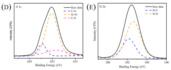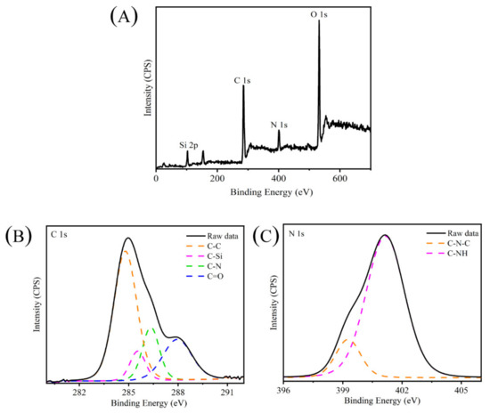 In the full XPS spectrum of CAP (Figure 3A), the binding energy signals at 102.8 EV, 284.8 EV, 400.8 EV, and 531.8 EV can be attributed to the electronic binding energies of Si 2p, C 1s, N 1s, and O 1s of CAP, respecitvely [42]. The N and Si elements are mainly derived from OAP-POSS. The presence of four elements at the same time indicated that CAP was successfully obtained by the reaction of citric acid and OAP. Figure 3B shows the existing types of carbon elements in CAP, including C-C (284.80 EV), C-Si (285.55 EV), C-N (286.34 EV), and C=O (287.95 EV). Figure 3C shows the types of nitrogen in CAP, which are C-N-C (399.27 EV) and C-NH (401.15 EV). Figure 3D shows the modes of oxygen in CAP, which are C-O (430.66 EV), C=O (431.93 EV), and Si-O (432.47 EV). Figure 3E shows the existing types of Si elements in CAP, which are Si-C (102.15 EV) and Si-O (102.61 EV).
