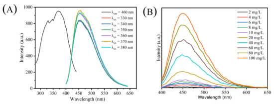 Figure 5A shows the excitation spectrum and emission spectrum of the fluorescence spectrum of CAP in the solid state, and the emission peak is at about 460 nm. The position of the fluorescence emission peak does not change with the position of the excitation light. The energy level gap does not change with the excitation, and the surface functional groups are stable. Figure 5B shows the fluorescence emission spectra of CAP aqueous solutions with different concentrations. With the increase in the concentration, the luminescence intensity of the solution increases gradually, which is a typical aggregation-induced luminescence phenomenon (AIE). With the increase in the molecular concentration, aggregation between molecules gradually occurs, and nonradiation channels such as molecular vibration or internal rotation are limited, which enhances the radiation channel and increases the fluorescence intensity [30,44].