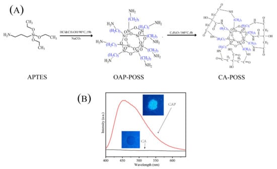 (A) Synthesis path of CAP (citric acid POSS); (B) photos of CA (citric acid) and CAP under UV (ultraviolet) lamp, and fluorescence spectrum of CA and CAP.