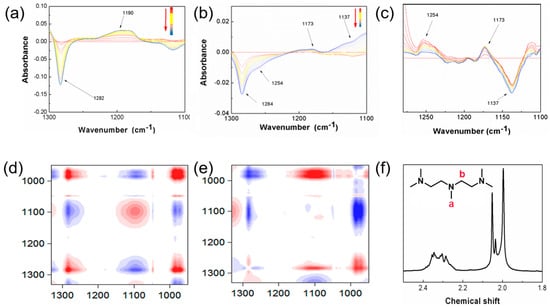 The differential spectrum of the two initiating systems (a) KPS-NaHSO3 and (b) KPS-PA at the wavelengths of 1300–1100 cm−1. (c) The derivative curves of differential spectrum of KPS-PA at the wavelengths of 1300–1100 cm−1. (d) Synchronous and (e) asynchronous 2D IR spectrum of the polymerization of AM initiated by KPS-PA. (f) 1H-NMR spectrum of pentamethylene triamine (PA).
