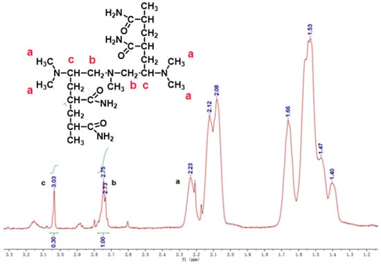 The NMR spectra of the PA-initiated system are shown in Figure 3. The alternating methylene and methine on the chains appear in the peaks at around 1.5 and 2.1 ppm, respectively. The -CH3 (a) at the PA structural unit shows a peak at 2.2 ppm, and the original -CH2- (b) is involved in the redox reaction to form methine with a peak at 3.03 ppm compared to the theoretical value of 2.8 ppm on account of deshielding effect. The chemical shift of -CH2- (b) is also shifted to 2.7 ppm due to the same effect. From the integrated area of the peak, S(c):S(b) = 0.3:1, the most simplified ratio of CH:CH2 is 3:5, indicating that some of the methylene in PA is oxidized to form methine, which, in turn, initiates the polymerization of the acrylamide monomer at this location.