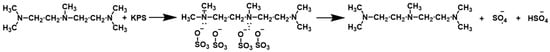 In order to further investigate the sequence of the reaction of the groups and to determine the active sites generated by the participation of PA in the reaction, we performed a two-dimensional infrared correlation spectrum analysis on the dynamic infrared spectrum of the KPS-PA system. As shown in Figure 2d,e, at 1254 cm−1 and 1137 cm−1, the synchronous correlation spectrum shows a negative correlation, while in the asynchronous graph, it shows a negative correlation, which can prove that the group reaction occurs synchronously and that the formation of tertiary carbon occurs simultaneously with the displacement of the carbon-nitrogen group []. In addition, the correlation spectra at both positions exhibit evidence that they are not uncorrelated, further proving that the methyl group adjacent to the nitrogen atom is not involved in the reaction. To sum up, we conclude that the methylene group in PA is involved in the redox reaction.