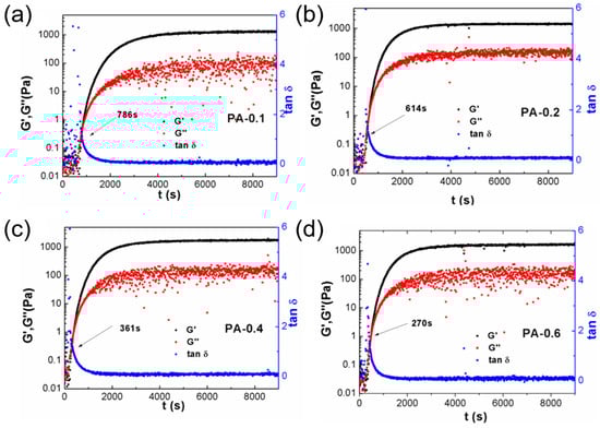 Evolution of the elastic modulus (G′), the viscous modulus (G″), and tanδ during the polymerization for different PA hydrogels of (a) PA-0.1, (b) PA-0.2, (c) PA-0.4, and (d) PA-0.6.