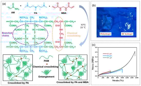 (a) The formation mechanism of the DC hydrogel; (b) the swollen PA and DC hydrogels; (c) Tensile stress–strain curves of the hydrogels of SC, PA and DCgels.