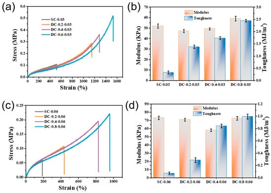 Figure 7b,d reveal that the toughness of the DC gel is more sensitive to PA and MBA concentrations, while the modulus is not sensitive to the PA concentration but that it is sensitive to the MBA concentration. As the concentration of MBA increases, the strength increases but elongation decreases significantly, and the toughness of the gel becomes worse. We attributed this to the following two aspects: On the one hand, the increase of MBA accelerates the non-uniformity of the network. On the other hand, the chemical cross-linked network becomes tight, and the motion of the branched chains is restricted, weakening the ability of the hydrogel to dissipate this energy through untwisting. Therefore, in this study, we needed to keep the MBA at a low concentration. Interestingly, the PA gels consistently exhibited the same brittleness as the SC gels when the concentration of MBA reached 0.2%, regardless of the amount of PA that was added. For the PA gels, the elongation and toughness are greater than those of conventional gels (Figure 8a) but are far less than the DC gels.