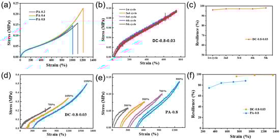 (a) Tensile stress–strain curves of PA gels; (b) five successive loading–unloading curves of DC-0.8-0.03 gels at the strain of 750% and (c) corresponding resilience. (d) Stress–strain curves of DC-0.8-0.03 gels during three consecutive loading–unloading cycles at maximum strains of 750%, 1050%, and 1350%. (e) Stress–strain curves of PA-0.8 gels during four consecutive loading–unloading cycles at maximum strains of 300%, 500%, 700%, and 900%. (f) Resilience of PA-0.8 gels and DC-0.8-0.03 gels.