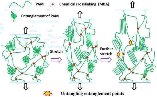 Similarly, we completed stepwise cycles for the PA and DC hydrogels, respectively, to further illustrate that the entanglement network formed by the branched chains played an energy dissipation role in the gel. As shown in Figure 8d–f, the energy dissipation of the PA gel is more obvious, and the hysteresis loop at a small strain rate can be an order of magnitude higher than that of DC gel. Additionally, the hysteresis and loop residual strain are larger as the strain increases. Based on the above results, we obtained the toughening mechanism of the DC gels, as shown in Figure 9. The energy dissipation for DC gel is generated by the slip or untwisting of the branched chains, and although the slip or untwisting of the branched chains is affected by the external chemical cross-linking network, the energy dissipation mechanism introduced through the branched chains can lead to a significant enhancement of the toughness of the gel.