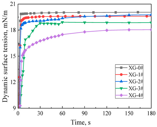 The dynamic surface tension (DSTs) of each foam dispersion changes with time, as shown in Figure 1. The platinum flakes touching the surface of the dispersion and the surface tension value increases sharply from zero in only a few seconds. Then, the surface tension slowly increases with time and reaches a relatively stable value after a brief increase. The stable value is called the equilibrium surface tension (EST). The surface tension of the foam dispersion (XG-0#, XG-1#) without XG tends to balance at 30 s. The addition of XG delays the time for the dispersion to reach EST, and the higher the concentration of XG, the longer it takes to reach EST, but all the foam dispersions reach EST within 150 s. The ESTs of XG-1# and XG-2# dispersions are almost equal, but the DST curve of XG-2# is lower than that of XG-1# before reaching the EST. In addition, the DST curve gradually decreases, indicating that the surface activity gradually increases as the XG concentration increases. The EST value of XG-0# is 20.041 mN/m, which is between the EST of individual FS-50 solution at cmc (13.89 mN/m [28]) and the EST of individual SDS solution at cmc (34.43 mN/m [30]). The results indicate that SDS and FS-50 molecules coexist at the gas–liquid interface. The EST of XG-4# is 18.094 mN/m, indicating that the addition of NPs and XG enhanced the surface activity of SDS and FS-50.