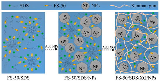 The difference between the EST values of the foam dispersions was only about 2 mN/m with the increasing concentration of XG and NPs, indicating that XG and NPs had a slight effect on the molecular interactions of FS-50/SDS at the air/liquid interface. However, the conductivity and viscosity of the dispersions were affected significantly by the intense molecular interactions between the molecules of FS-50/SDS/NPs/XG in the bulk solutions. The schematic diagram of the molecular interaction in the mixed dispersions of FS-50/SDS/NPs/XG is shown in Figure 2.