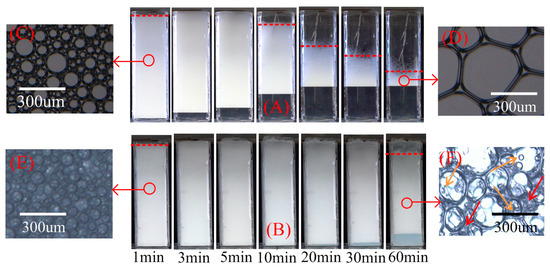 Process of foam decay and drainage under T = 200 °C: (A) XG-0#, (B) XG-4#, (C,E) foam morphology at zero, (D,F) foam morphology at 60 min.