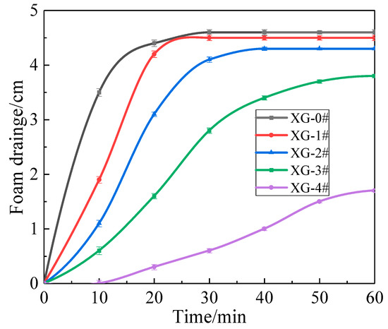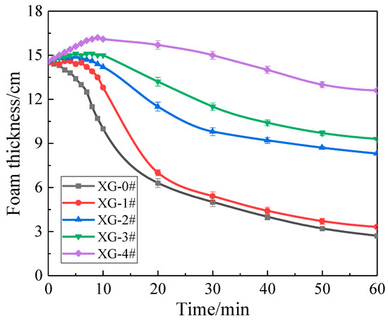 To quantitatively analyze the foam decay process under radiation heat, the foam thickness (the height of upper surface of foam layer minus the height of the interface between the foam layer and the liquid drained) change versus time was measured, as shown in Figure 5. The foam thickness curves gradually increased with the increasing XG concentration. In particular, the foam thickness curves of XG-1#, XG-2#, XG-3#, and XG-4# gradually increased after the heating started, and then gradually decreased over time. It should be ascribed to foam expansion under heat at an early stage, as described in Figure 4. The maximum foam thickness of XG-1#, XG-2#, XG-3#, and XG-4# were 14.6, 14.9, 15.1, and 16.2 cm, reached at 3, 5, 7, and 9 min, respectively. After a brief stabilization near the peak, the bubble began to collapse. However, the foam thickness curve of XG-0# kept decreasing from the beginning, which is inconsistent with the phenomenon of the foam expansion stage in Figure 4. The results show that the increase in XG concentration led to the enhancement of the foam layer stability under heat.
