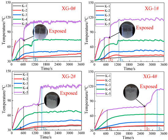 The temperature at different depths inside the foam layer is shown in Figure 7. K-1–K-5 represent the temperature change curve of thermocouples at different depths in the foam layer. Generally, all the temperature curves increased over time. For all the experiments, the temperature curves of K-1, K-2, and K-3 exhibited a similar change trend, that is, they increased slowly over time, and reached a stable temperature value after 1200 s. However, the temperature curves of K-4 and K-5 showed different trends. For XG-2# and XG-4#, the curves of K-4 showed the same trends as those of K-1, K-2, and K-3. However, K-5 of all four experiments and K-4 of XG-0# and XG-1# exhibited ladder-shaped curves. The ladder-shaped curve can be explained by whether the thermocouples were exposed to air or not. At the beginning of the experiment, the temperature of the foam layer increased gradually over the heating time. The temperature values of the foam layer around K-5 reached approximately 80 °C at t1 and kept relatively stable. At this period, K-5 was still wrapped in the foam layer. The temperature around K-5 showed the second rapid increase at t2. The reason is that the foam around K-5 disappeared completely under heat at t2, and K5 was directly exposed to the heat source. The K-5 curves reached a relatively stable temperature value again at t3. For K-4 curves of XG-0# and XG-1#, the thermocouples of K4 were also directly exposed to air under the heat source at a moment close to t3.
