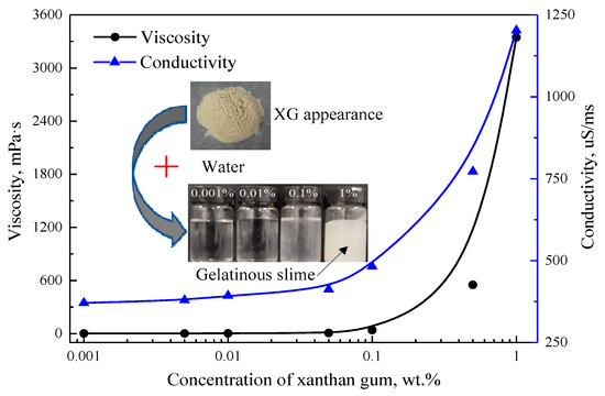 The appearance of XG and its solution’s apparent morphology, viscosity and conductivity changes with concentration are shown in Figure 9. The results show that the viscosity and conductivity of the solution increase sharply, and the solution looks like gelatinous mucus when the concentration of XG exceeds 0.1%, which was unsuitable for the present study. Hence, the low concentrations of 0.01%, 0.03% and 0.05% of XG were selected in this study.