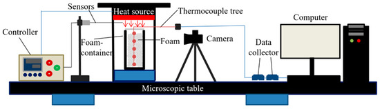 The thermal insulation performance of the foam layer under radiant heat source was studied, using a testing device for foam thermal stability, as shown in Figure 10. A similar experimental setup can be seen in the paper [41,42]. In this study, the device consisted of a set of a SGM series simulated fire field radiation heat source system, sample loading module, and foam container. The radiant heat source system consisted of heating plates, temperature control instruments, sensors, and a stainless-steel bracket. The total heating area of the heating plate was 150 mm × 150 mm, and the heating temperature was adjusted by a temperature control instrument, and the temperature range was 0 ~ 400 °C . The data acquisition module consisted of five K-type armored thermocouples and two data collectors. The foam container was a square quartz glass tube of 2 cm × 3 cm × 15 cm.