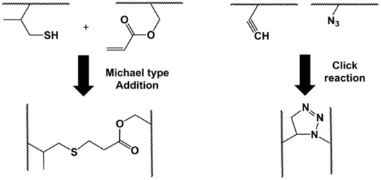 Representation of Michael-type addition and Click reactions forming a cross-linked structure.