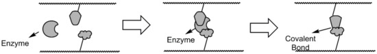 The main advantage of the enzymatic method is that the cross-linking of the hydrogel occurs under mild conditions without the need for the use of low molecular weight compounds (monomers, initiators, cross-linking agents), irradiation, or prior polymer functionalization to favor its cross-linking [31,119]. Enzymes often exhibit a high degree of substrate specificity, potentially avoiding side reactions during cross-linking. This advantage makes it possible to control and predict the cross-linking kinetics and control the overall cross-linking rate. For this reason, this method is suitable for in situ gelation systems [119,120]. Figure 4 illustrates this method by unionizing the enzyme and the available substrate, forming a covalent bond within the cross-linking structure.