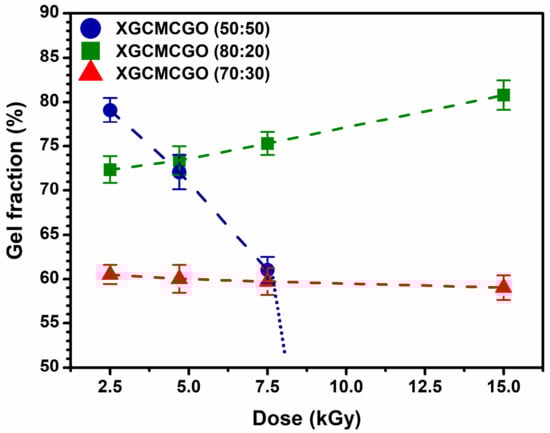 The gelation dose (Dg) is another parameter that shows the minimum dose required to obtain an insoluble gel during irradiation. Dg values decreased as the concentration of polymers and crosslinking agent (N′N—methylenebis(acrylamide), NMBA) increased. We observed that the gelation occurred at a very low dose (0.23 kGy) for the XGCMCGO (50:50) hydrogel.