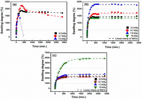 Figure 2 shows the variation of the swelling degree (SD) at equilibrium, as a function of time and the absorbed dose, for the XGCMCGO hydrogels. All hydrogels showed good swelling ability. The maximum SD obtained at a dose of 15 kGy was ~6000%, which classified these XGCMCGO (70:30) hydrogels as “superabsorbent hydrogels”. In the case of hydrogels with low concentrations of CMC, XG, AA, and NMBA, the SD had a value of 2250% for the XGCMCGO (50:50) hydrogel obtained at 4.7 kGy. At irradiation doses greater than 5 kGy, this hydrogel was degraded in deionized water (DI) in less than 2 h. For the XGCMCGO (80:20) hydrogel, the SD showed a maximum value of 2300% at a dose of 7.5 kGy.