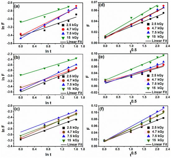 Figure 3a–c show graphically, in logarithmic scale, the values of the parameter F = f(t). Figure 3d–f show graphically F = f (t 0.5). The values of the coefficients n, k, and D were calculated from the slope and intersection of the lines resulting from the swelling kinetics. The calculated values for the diffusion exponents n were less than 0.5 for the XGCMCGO (50:50) hydrogel at all irradiation doses, thus indicating that the solvent transport mechanism was of a Fickian type.