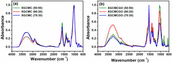 Figure 5a,b shows the characteristic FTIR spectra for nonirradiated polymeric blends with various ratios (XG:CMC) without GO (left side) and containing GO (right side). According to the acquired FTIR spectra, the displacement of the characteristic bands located in the range of 3600–600 cm−1 toward smaller wavenumbers corresponded to the formation of hydrogen bonds due to the miscibility of the polymers. In addition, increases in the band intensities in this area were proportional to the concentrations of natural polymers (XG and CMC) included in the polymeric blend.