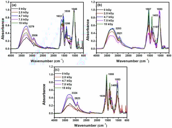 The FTIR-ATR spectra, corresponding to XGCMCGO hydrogels irradiated at doses in the range of 2.5–15 kGy, are shown in Figure 6. It can be seen that the intensity of the absorption bands varied with the irradiation dose.