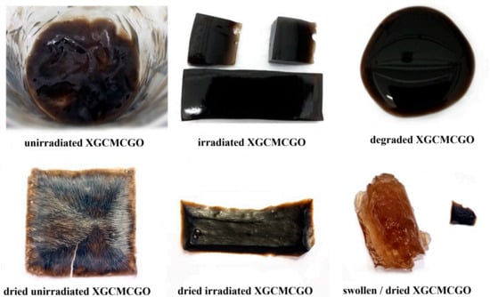 By varying the absorbed dose, the degree of crosslinking, on which the swelling degree strongly depends, can be controlled. Since it has many hydrophilic groups on its surface, GO is an excellent material that can be used in mixtures with several polymers in order to obtain new hydrogels with superabsorbent properties [,,]. Natural polymers such as CMC and XG are more susceptible to degradation when they are irradiated in aqueous solutions due to the indirect effect of water. The effect of e-beam irradiation on XG, which is used as an ingredient in the food industry to determine irradiation stability, has been investigated by Li et al. []. The study showed that the viscosity of irradiated aqueous XG-based solutions was reduced as the irradiation dose increased (5–50 kGy), suggesting degradation or depolymerizations of polysaccharide macromolecules.