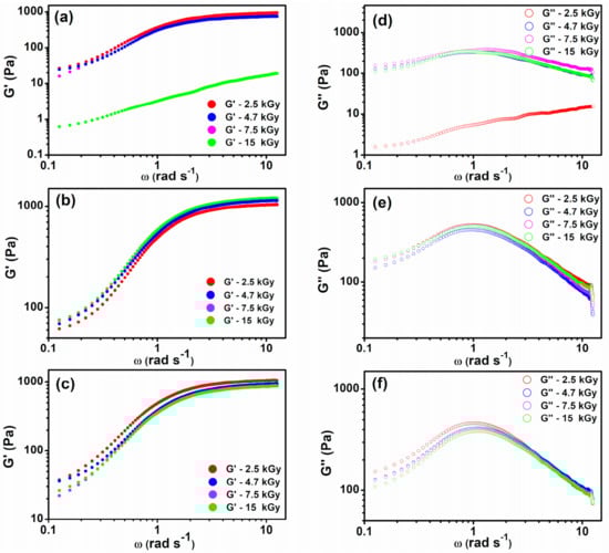 Elastic modulus (G′), as a function of the angular frequency (ω), of the (a) XGCMCGO (50:50), (b) XGCMCGO (80:20), and (c) XGCMCGO (70:30) hydrogels and their evolutions as a function of the absorbed dose. Viscous modulus (G″), as a function of the angular frequency (ω), of the (d) XGCMCGO (50:50), (e) XGCMCGO (80:20), and (f) XGCMCGO (70:30) hydrogels, and their evolutions as a function of the absorbed dose.