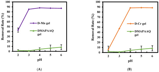 For the adsorption of As(III) in aqueous environments, pH is a crucial parameter that affects the surface charge of the adsorbent as well as the conversion of the As species (Figure 1). Generally, different forms of As(III) are present in aqueous environments. H3AsO3 is dominant under the acidic conditions (pH < 7), while the anions, such as H2AsO3−, HAsO32−, and AsO33− are dominant in alkaline environments [24]. To determine the effect of external pH on the As removal property of the gel, the As(III) adsorption by the D-Mn and D-Cr gels was first investigated in the pH range of 2−6 (Figure 2). As shown in Figure 2A,B, the DMAPAAQ gel removes a comparatively lesser amount of As (the removal rate of the DMAPAAQ < ~10%) than that of the D-Mn and D-Cr gels due to the formation of H3AsO3 under acidic conditions, which could interfere in the ion exchange between the Cl− and As-based anions. Figure 2 shows that the As(III) removal rate of the D-Mn and D-Cr gels could still be maintained at a high level between pH 4 and 6. The adsorption process took place inside the gel, on which the effect of the external environment was minimal. Under acidic conditions, the redox reaction between MnO4−/Cr2O72− and As(III) in the gel is more likely to occur. Meanwhile a greater number of As(V) anions are produced by redox reactions, which eases As adsorption via the exchange of Cl− and As(V) anions in the gels. Figure 2A also shows that the As removal rate of the D-Mn gel was significantly higher than that of the DMAPAAQ gel. This was because the Mn oxide supported in the gel oxidised As (III) into As (V), and also adsorbed the oxidation product, i.e., As (V).